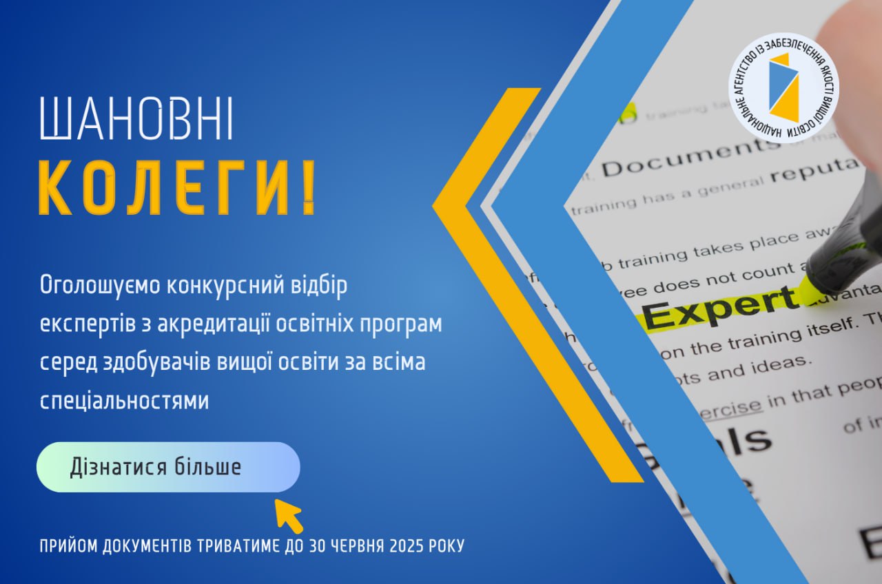 🧑🎓 Національне агентство оголошує конкурсний відбір експертів з акредитації освітніх програм серед здобувачів вищої освіти ІІ-го (магістерського) та ІІІ-го (освітньо-наукового/освітньо-творчого) рівнів за всіма спеціальностямй.