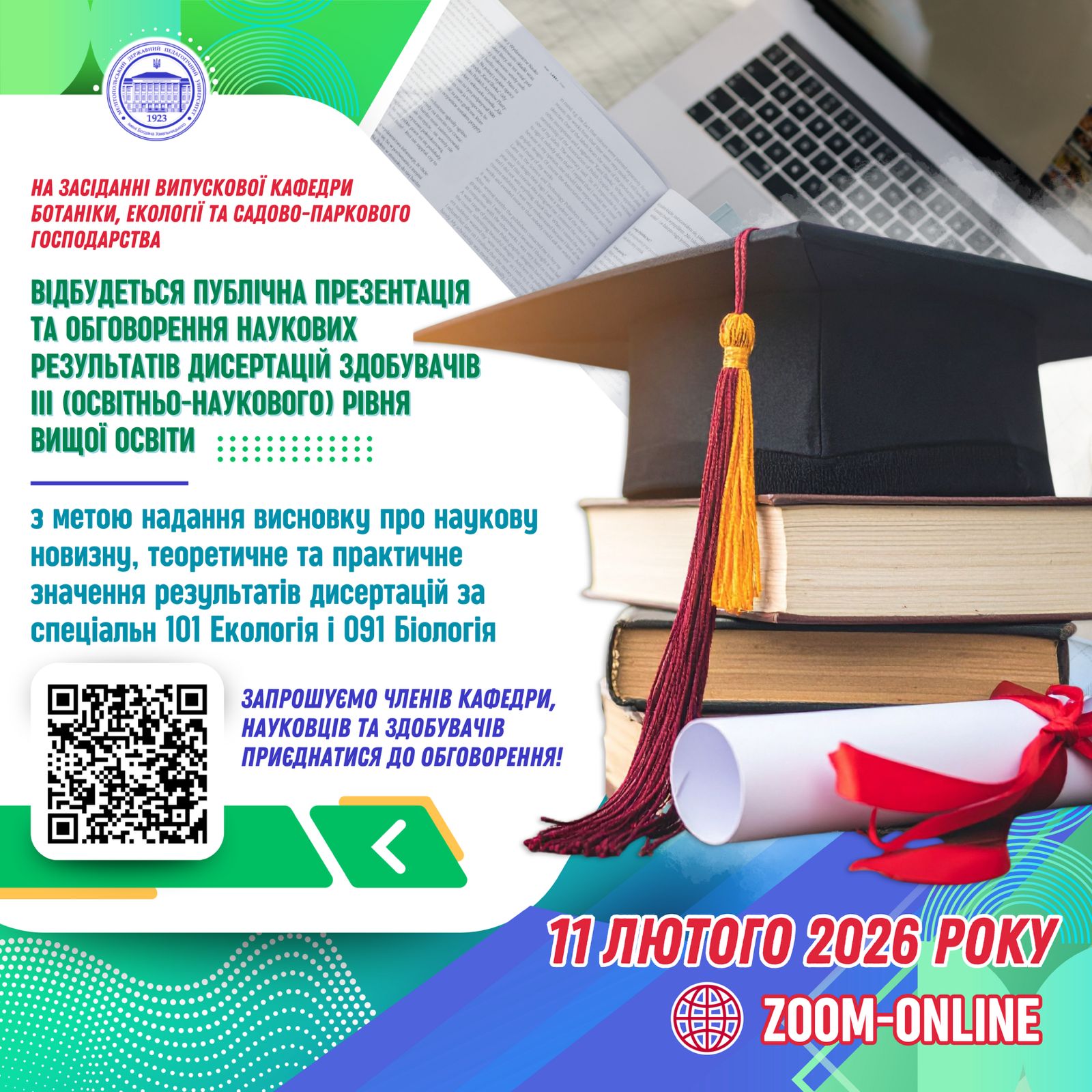 11 лютого 2026 року на засіданні випускової кафедри ботаніки, екології та садово-паркового господарства відбудеться публічна презентація та обговорення наукових результатів дисертацій здобувачів ІІІ (освітньо-наукового) рівня вищої освіти з метою надання висновку про наукову новизну, теоретичне та практичне значення результатів досліджень. 👩🔬 Подпрятова Наталія Олександрівна. Тема дисертації: «Фітоіндикація екологічних режимів техноземів Нікопольського марганцеворудного басейну», що подається...Read More