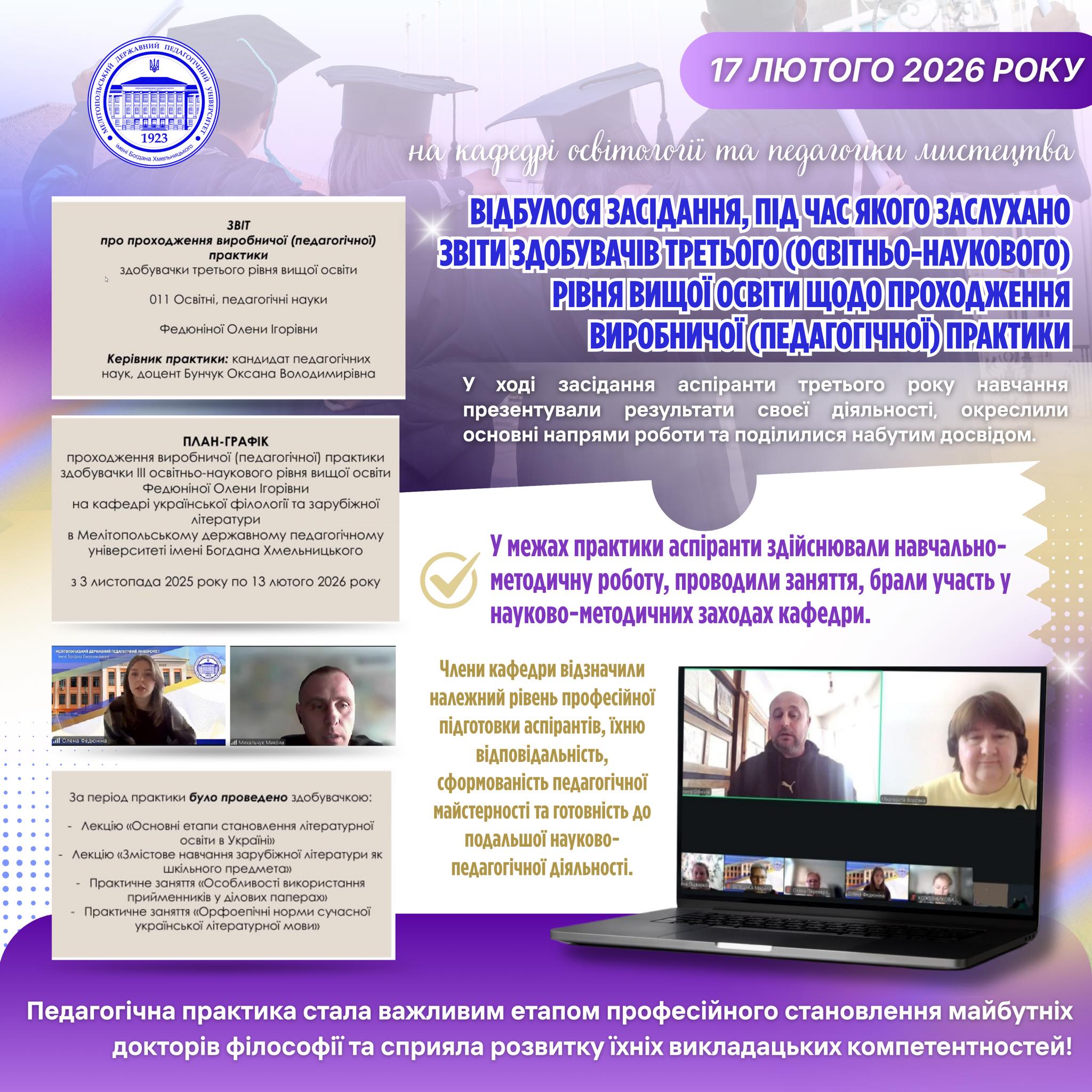 17 лютого 2026 року на кафедрі освітології та педагогіки мистецтва відбулося засідання, під час якого заслухано звіти здобувачів третього (освітньо-наукового) рівня вищої освіти щодо проходження виробничої (педагогічної) практики.