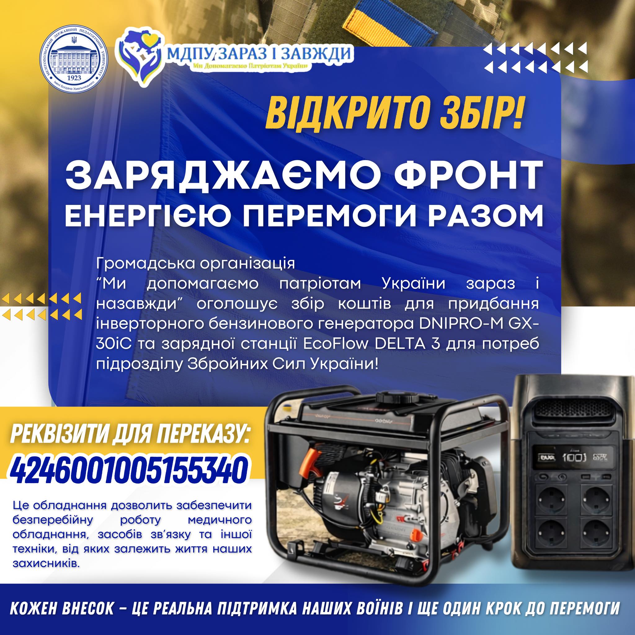 Громадська організація «Ми допомагаємо патріотам України зараз і назавжди» оголошує збір коштів для придбання інверторного бензинового генератора DNIPRO-M GX-30iC та зарядної станції EcoFlow DELTA 3 для підрозділу Збройних Сил України, де служить наш студент — Панченко Сергій, бойовий медик САДН (самохідного артилерійського дивізіону) 53-ї окремої механізованої бригади.