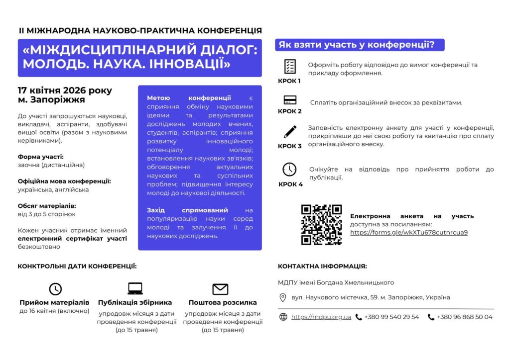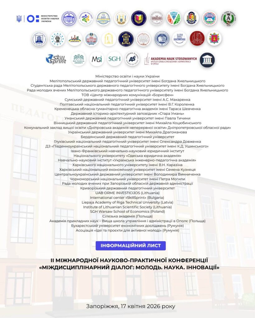 Студентська рада МДПУ імені Богдана Хмельницького запрошує науковців, викладачів, аспірантів, здобувачів вищої освіти (разом з науковими керівниками) долучитися до участі у ІІ Міжнародній науково-практичній конференції “Міждисциплінарний діалог: Молодь. Наука. Інновації”, яка відбудеться 17 квітня 2026 року.
