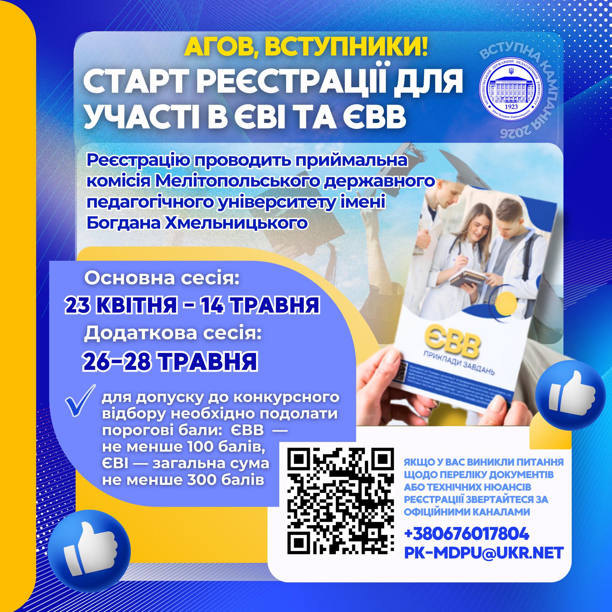 Шановні майбутні доктори філософії (PhD)! Повідомляємо, що старт реєстрації для участі в ЄВІ та ЄВВ РОЗПОЧАЛАСЬ – 23 КВІТНЯ! ТЕРМІНИ РЕЄСТРАЦІЇ: Основна сесія: з 23 квітня до 14 травня 2026 року. Додаткова сесія: з 26 по 28 травня 2026 року (для тих, хто не встиг в основний період). ЩО ПОТРІБНО СКЛАСТИ ДЛЯ ВСТУПУ НА PhD?...Read More