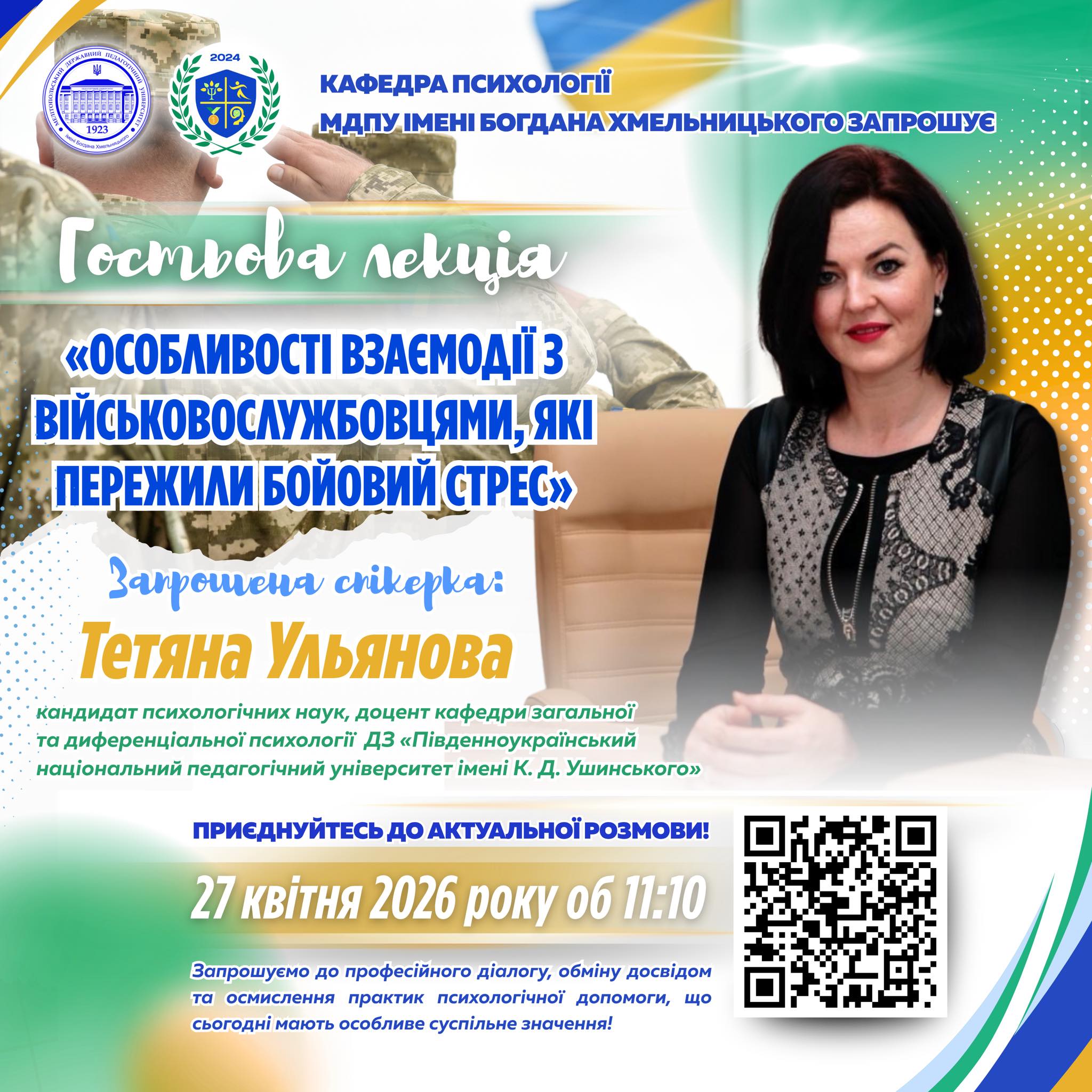 Кафедра психології МДПУ імені Богдана Хмельницького запрошує здобувачів освіти, викладачів, практичних психологів та всіх зацікавлених долучитися до гостьової лекції, присвяченої надзвичайно актуальній темі психологічної підтримки та професійної взаємодії з військовослужбовцями, які пережили бойовий стрес – “Особливості взаємодії з військовослужбовцями, які пережили бойовий стрес”. У сучасних реаліях ця проблематика набуває особливої ваги, адже фахове розуміння наслідків...Read More