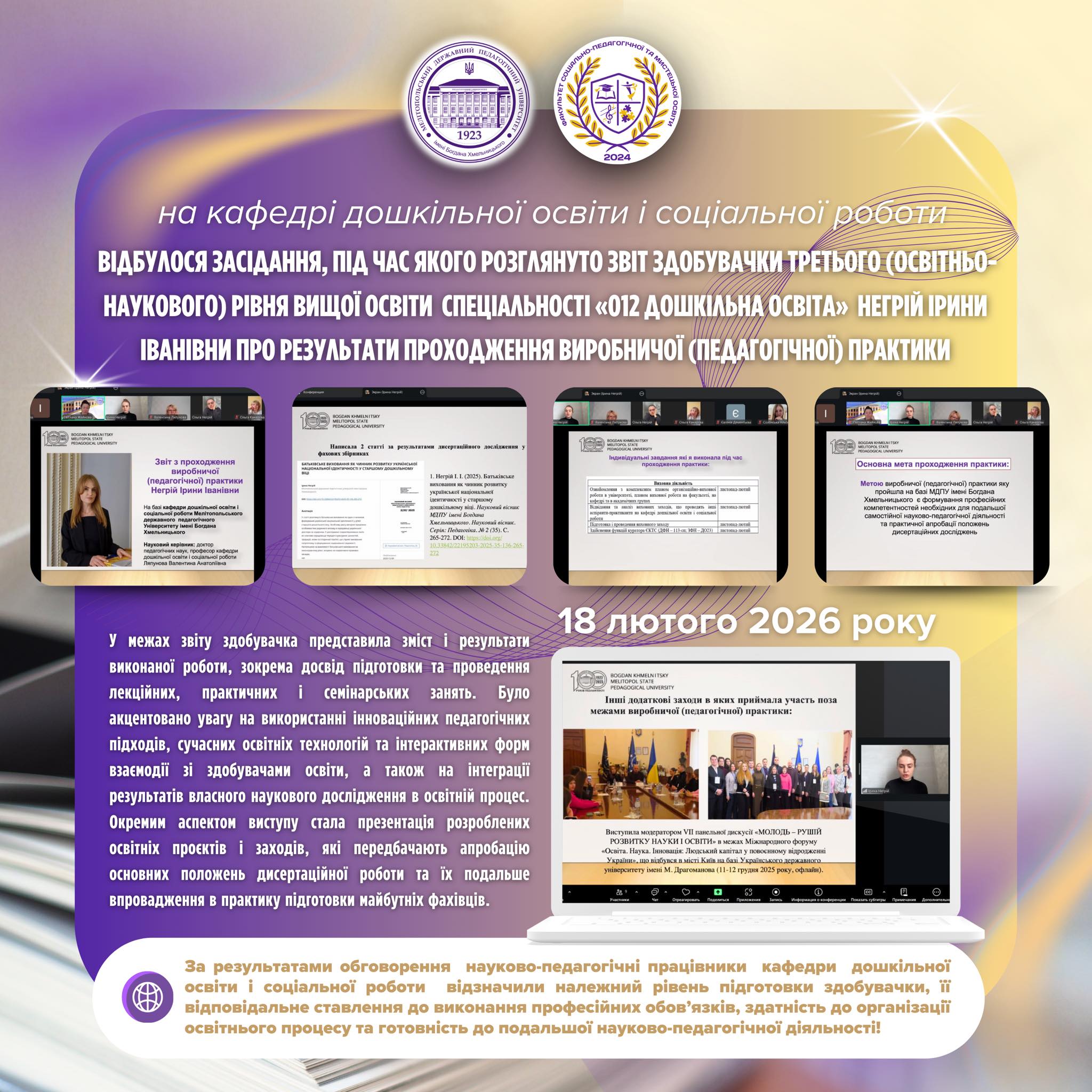 18 лютого 2026 року на кафедрі дошкільної освіти і соціальної роботи МДПУ ім. Б. Хмельницького відбулося засідання, під час якого розглянуто звіт здобувачки третього (освітньо-наукового) рівня вищої освіти спеціальності «012 Дошкільна освіта» Негрій Ірини Іванівни про результати проходження виробничої (педагогічної) практики. Практика тривала з 3 листопада 2025 року по 13 лютого 2026 року на базі...Read More