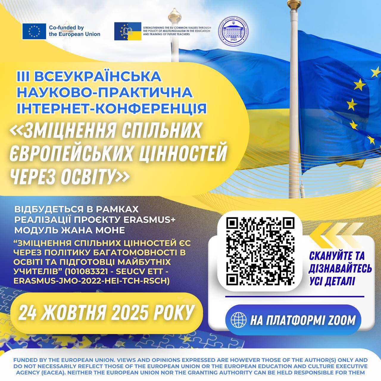 Шановні науковці, професіонали-практики, здобувачі вищої освіти та всі зацікавлені особи! Запрошуємо вас взяти участь у роботі III ВСЕУКРАЇНСЬКОЇ НАУКОВО-ПРАКТИЧНОЇ ІНТЕРНЕТ-КОНФЕРЕНЦІЇ «ЗМІЦНЕННЯ СПІЛЬНИХ ЄВРОПЕЙСЬКИХ ЦІННОСТЕЙ ЧЕРЕЗ ОСВІТУ»! Конференція відбудеться в рамках реалізації проєкту програми Європейського Союзу Erasmus+ напряму Модуль Жана Моне “Зміцнення спільних цінностей ЄС через політику багатомовності в освіті та підготовці майбутніх вчителів” (101083321 –...Read More