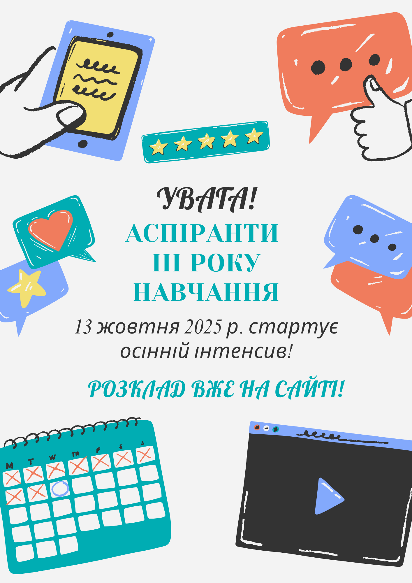 До уваги! Здобувачі ІІІ (освітньо-наукового) рівня вищої освіти! Осінній інтенсив стартує вже 13 жовтня! Це ключовий період знаменує початок завершення освітньої частини вашої програми. Використовуйте цей час максимально ефективно! 📌 Ваші кроки: Перевірити доступ до своїх кабінетів. Своєчасно приєднатися до всіх курсів. Розпланувати графік та приділити максимум уваги навчальному процесу. 🗓 Розклад занять доступний на...Read More