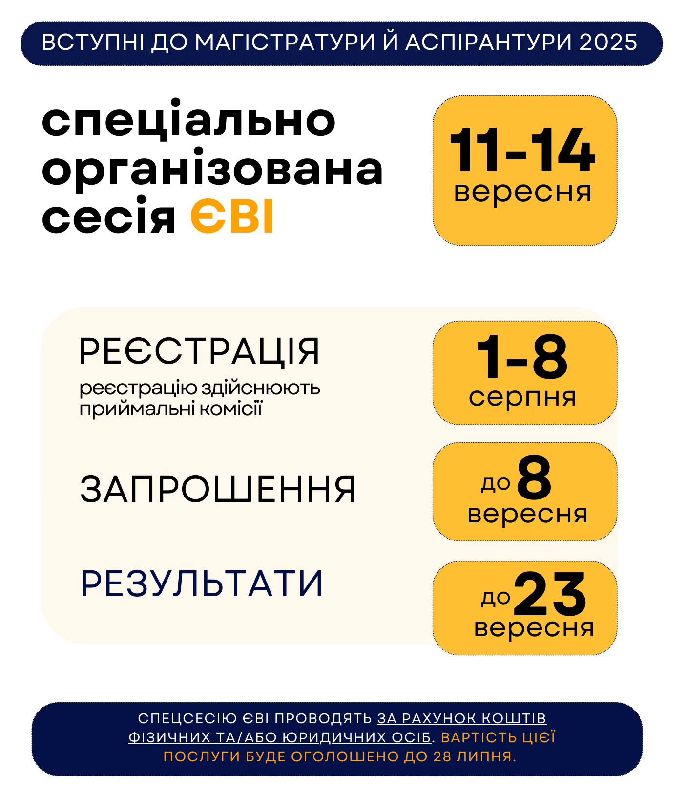 Відповідний наказ затвердило Міністерство освіти і науки України. У цій сесії можуть взяти участь вступники, які не реєструвалися для участі в основній або додатковій сесіях ЄВІ, а також яких було зареєстровано, але вони не з’явилися на іспит. Крім того, можливість скласти ЄВІ надано тим, хто бажає покращити свій результат і скористатися додатковим шансом для вступу до аспірантури...Read More