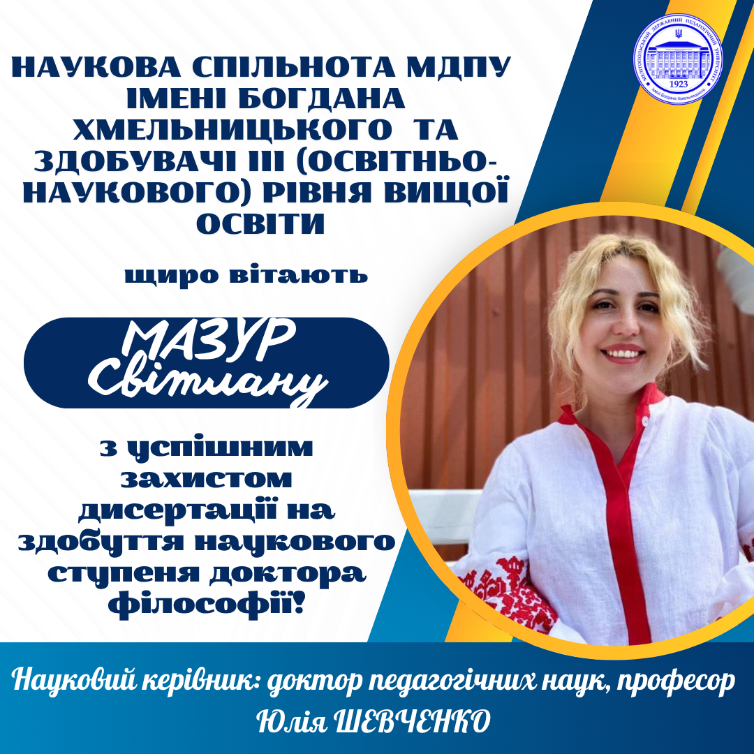 Сьогодні, 15 липня 2025 року, відбувся захист дисертаційного дослідження МАЗУР Світлани Олександрівни, аспірантки спеціальності 011 Освітні, педагогічні науки на тему «Формування цінності моральної автономії підлітків в умовах громадських організацій». Науковий керівник: доктор педагогічних наук, професор кафедри початкової і спеціальної освіти Юлія Михайлівна ШЕВЧЕНКО. Академічна спільнота МДПУ та здобувачі третього (освітньо-наукового) рівня вищої освіти вітають МАЗУР Світлану та її наукового...Read More