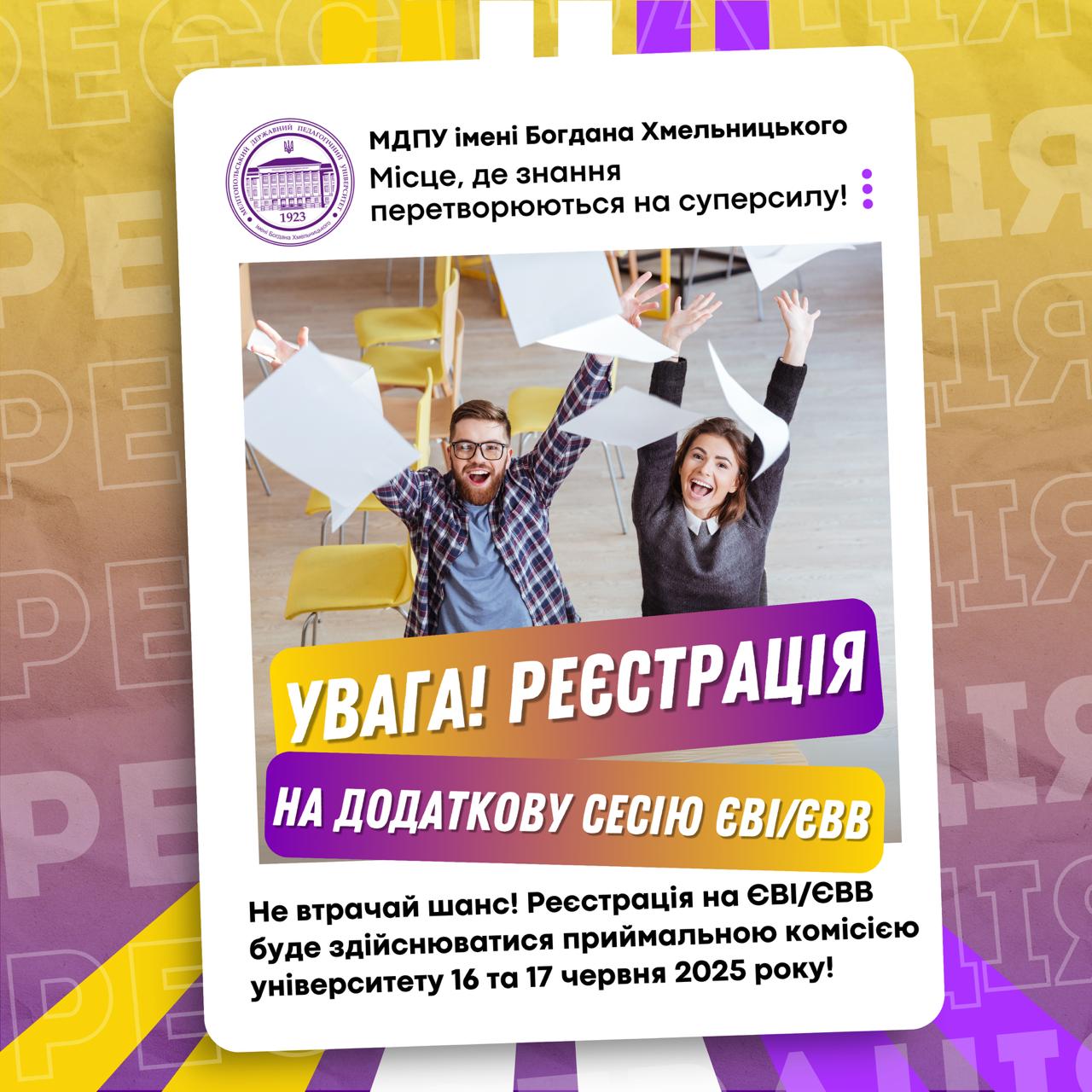 ⁉📚Не встигли зареєструватися на основну сесію ЄВІ/ЄВВ? Не втрачайте шанс! 📌📆 16–17 червня буде відкрито реєстрацію на додаткову сесію ЄВІ/ЄВВ. 👉🏻Реєстрація відбувається через приймальну комісію МДПУ імені Богдана Хмельницького! 📞 Контактна інформація:📍 pk-mdpu@ukr.net;‪+380676017804‬ (Дубяга Світлана Миколаївна) ⏳✅ Радимо не відкладати на останній момент, щоб мати час на якісну підготовку та подання всіх необхідних документів!
