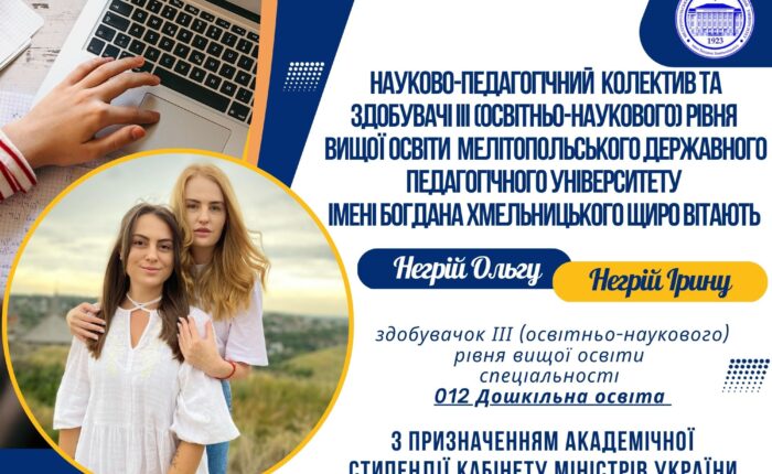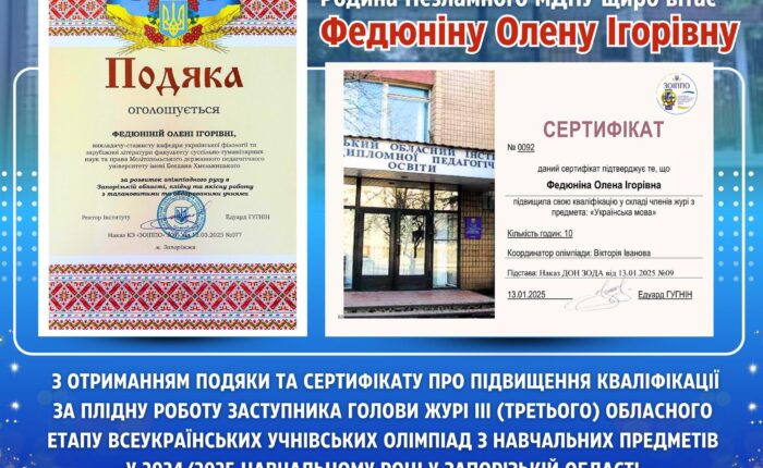 Академічна спільнота незламного Мелітопольського державного педагогічного університету імені Богдана Хмельницького з гордістю вітає ФЕДЮНІНУ Олену Ігорівну з черговим фаховим досягненням! Олена Ігорівна — аспірантка спеціальності 011 Освітні, педагогічні науки, викладач-стажист кафедри української філології та зарубіжної літератури — отримала ПОДЯКУ за вагомий внесок у розвиток олімпіадного руху у Запорізькій області, а також за плідну й якісну...