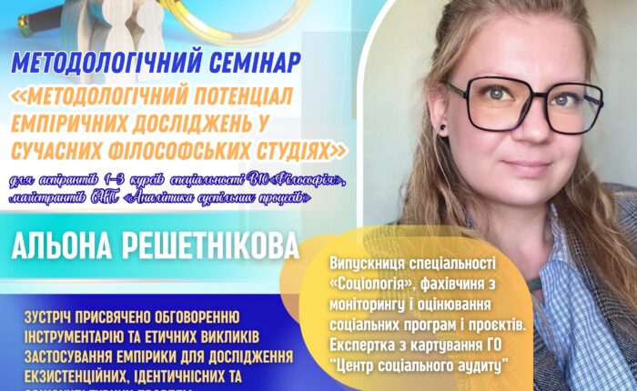 Кафедра соціології та філософії запрошує аспірантів 1–3 курсів спеціальності 033 «Філософія», а також магістрантів освітньо-наукової програми «Аналітика суспільних процесів» до участі у методологічному семінарі, присвяченому осмисленню потенціалу емпіричних досліджень у сучасних філософських студіях. У центрі уваги — інструментарій, методологічні межі та етичні виклики, що постають при застосуванні емпірики для дослідження екзистенційних, ідентичнісних і соціокультурних проблем....