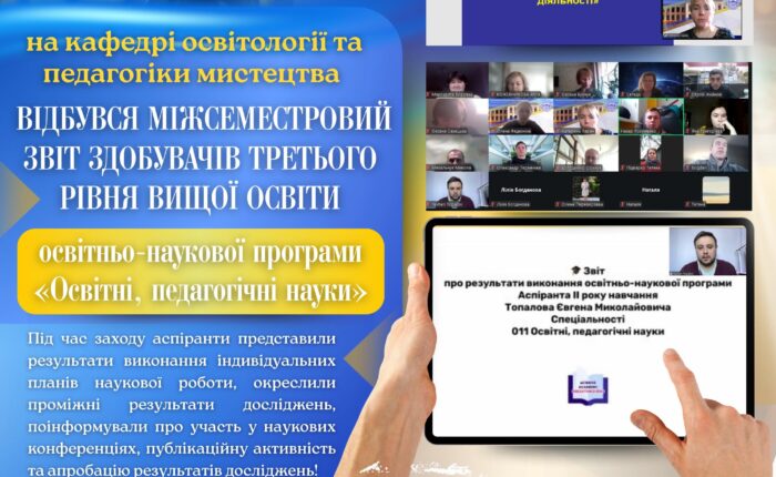 3 березня 2026 року на кафедрі освітології та педагогіки мистецтва відбувся міжсеместровий звіт здобувачів третього (освітньо-наукового) рівня вищої освіти освітньо-наукової програми «Освітні, педагогічні науки». Під час заходу аспіранти представили результати виконання індивідуальних планів наукової роботи, окреслили проміжні результати досліджень, поінформували про участь у наукових конференціях, публікаційну активність та апробацію результатів досліджень. Члени кафедри надали рекомендації...