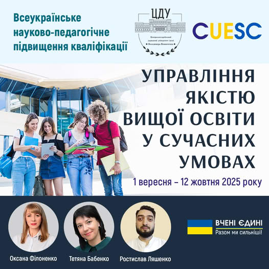 До участі у підвищенні кваліфікації запрошуються науково- педагогічні співробітники закладів вищої освіти, наукові співробітники наукових установ, практичні працівники, докторанти, аспіранти, студенти та всі охочі, які зацікавлені управлінням якістю вищої освіти у сучасних умовах. Форма участі – дистанційна. Організатори: Центральноукраїнський державний університет імені Володимира Винниченка та Центр українсько-європейського наукового співробітництва. Навчальне навантаження становить 6 кредитів ECTS...Read More